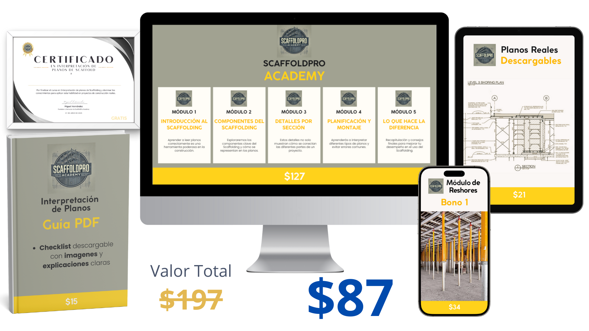 Este curso está diseñado para enseñarte desde cero a interpretar planos de Scaffolding, una habilidad muy valorada en la industria de la construcción. Con este conocimiento, reducirás errores, ganarás confianza y estarás listo para aprovechar nuevas oportunidades laborales en semanas.